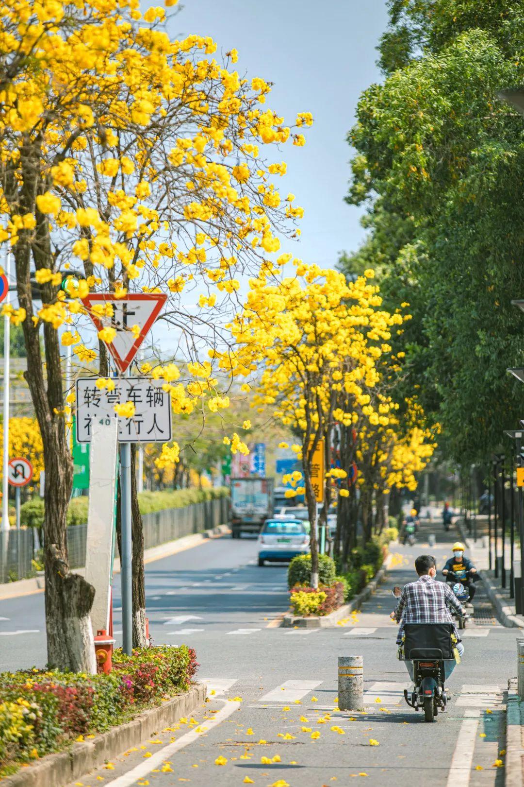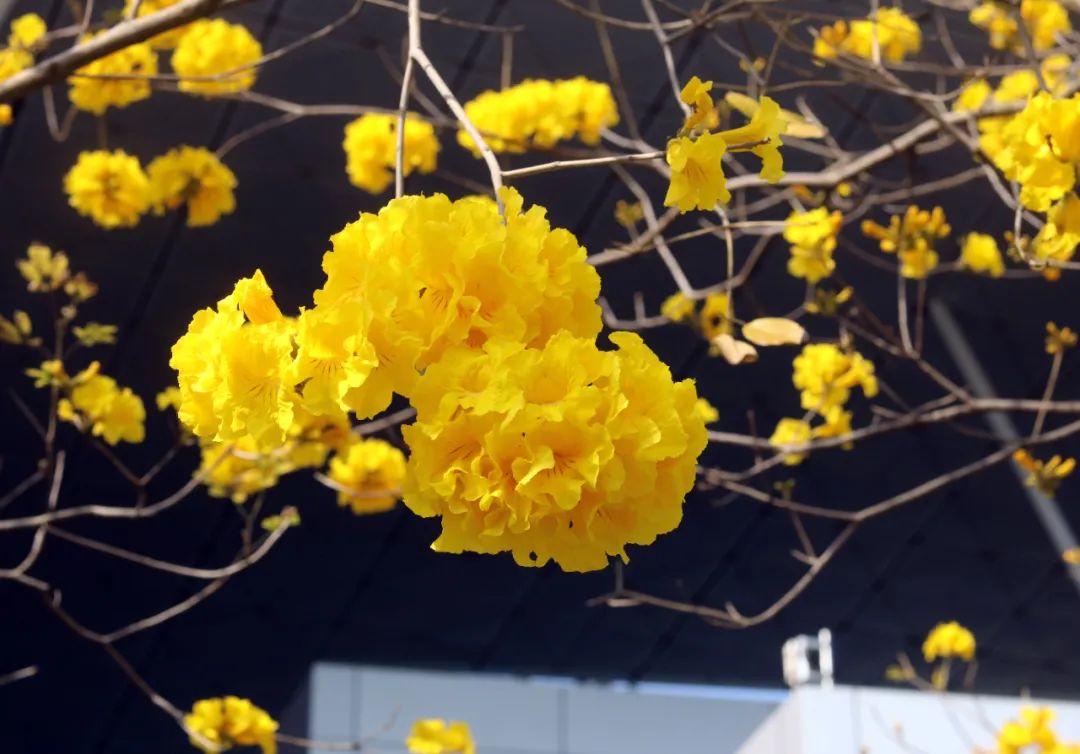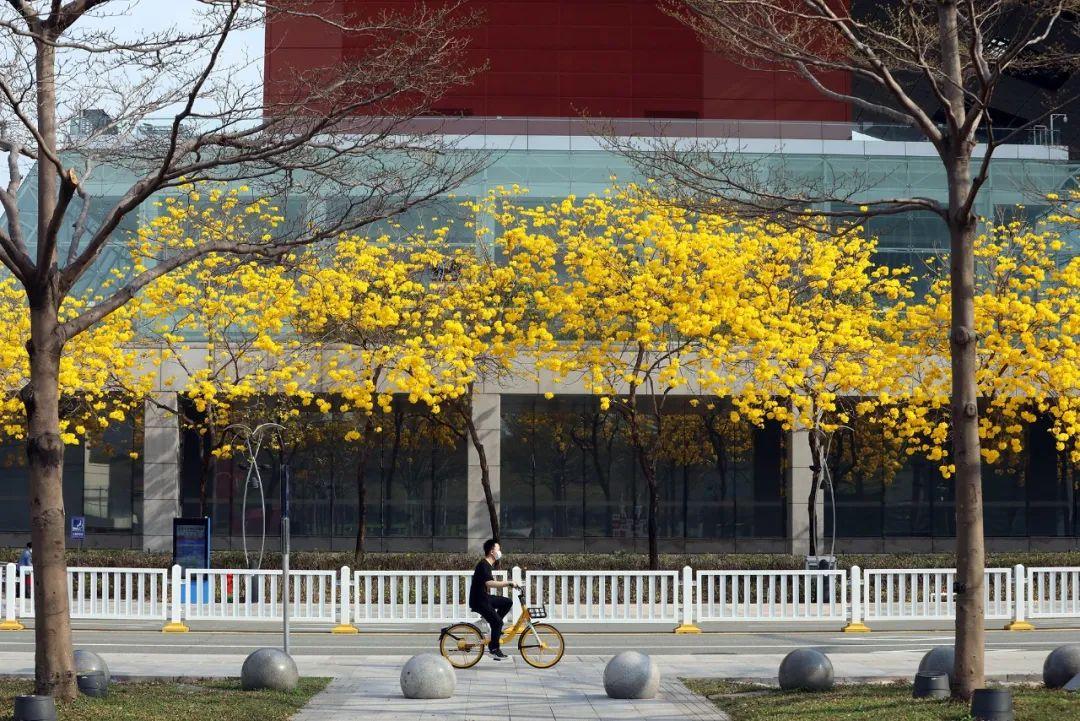 在市民中心、中心公园、莲花山公园、笔架山公园,黄花风铃木满树金黄,迎风绽放。