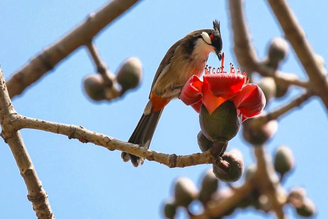 红耳鹎啄食木棉花。