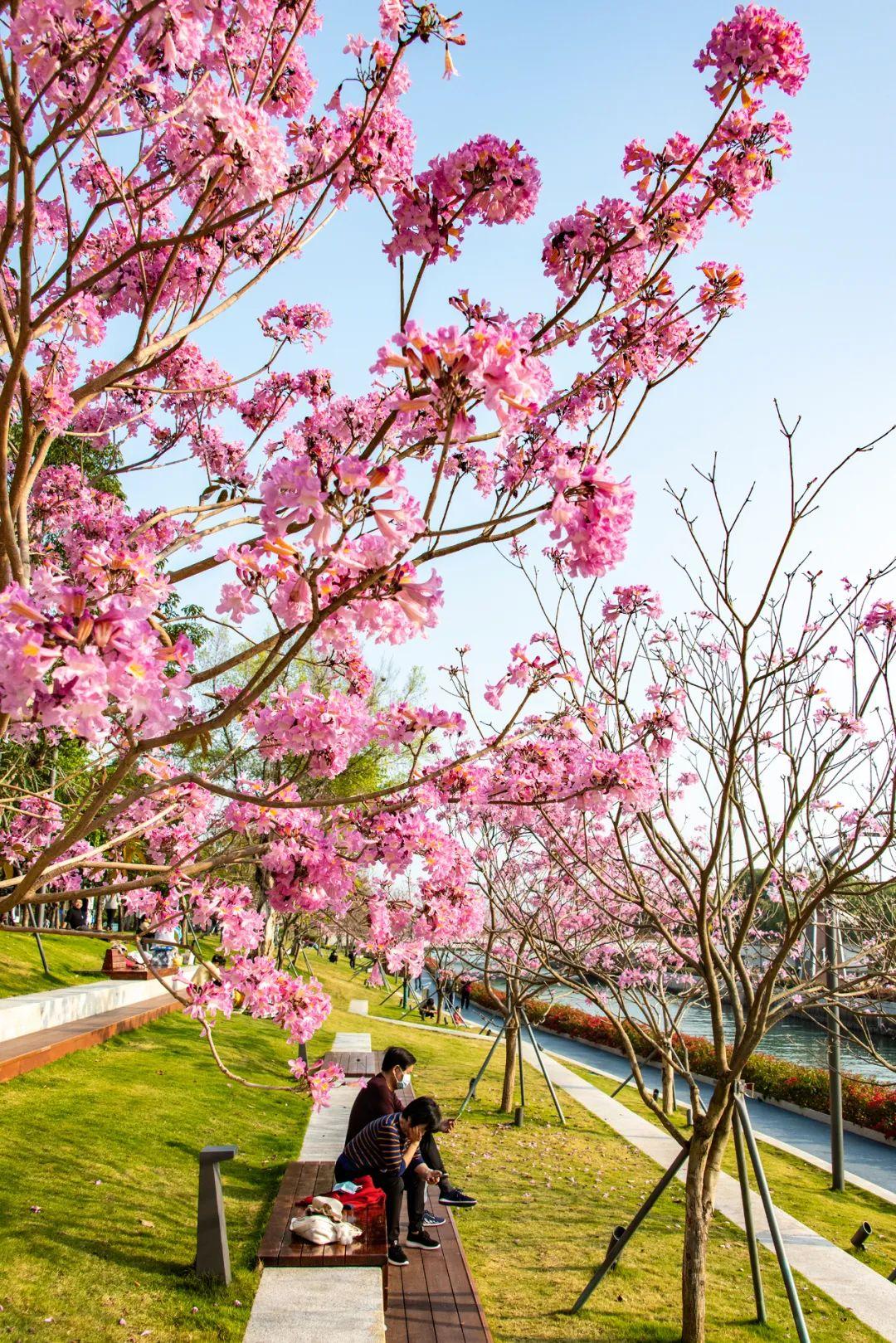 路人在紫花风铃木树下的长椅上休息,欣赏这如画的风景线。