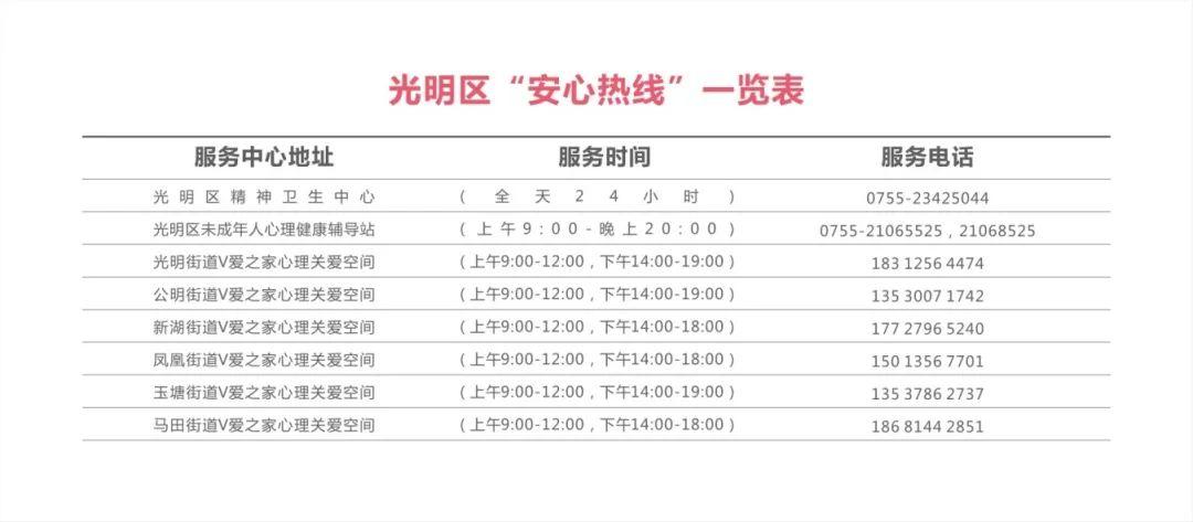 光明区实施“安心结对”计划,升级“安心行动Ⅲ”,深化隔离场所“安心行动”六项措施,依托“安心驿站”,各党群服务阵地积极统筹下沉心理健康服务队,开通多条专属“安心热线”,通过随时接听电话、主动问候服务等方式,为抗疫一线工作人员、隔离群众、特殊群体等提供心理援助、心理咨询、心理调适等服务,送上“安心微课”16场次。