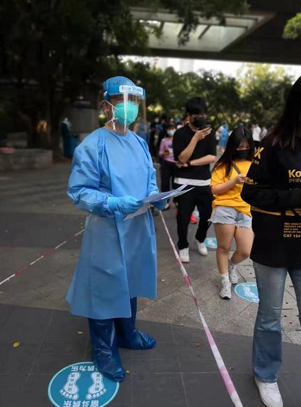 3月16日上午,已经连续2日在民乐社区进行志愿服务的叶军又一次加入了志愿者的队伍。他娴熟地帮助运送检测物资、协助居民登录核酸码、维护现场排队秩序。有邻居透过厚厚的防护口罩认出了他,看到他额头的汗水“啪嗒”地往下掉,不禁对他竖起了大拇指。