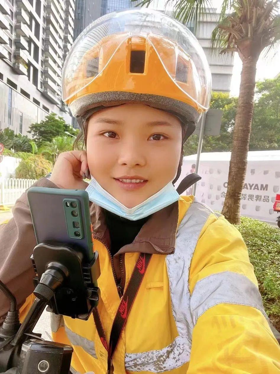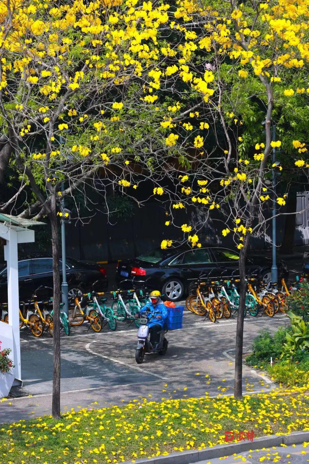 ▲深圳外卖小哥穿行在英雄花下