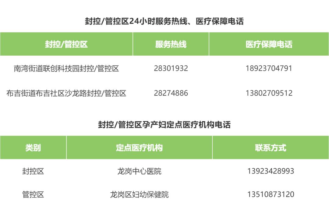 您好!根据疫情防控需要,自2022年3月14日起,龙岗区在南湾街道划定了封控区、管控区;自2022年3月15日起在布吉街道划定了封控区、管控区。正孕育宝贝的您或许会有些担忧与焦虑。疫情无情人有情,为了协助您在特殊时期做好孕产期保健,安全顺利迎接宝宝来临,我们为您提供如下服务: