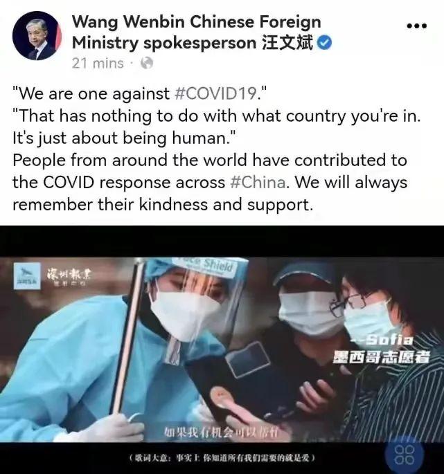 外交部新闻司副司长、发言人汪文斌在国际社交平台上对在抗疫中的深圳国际志愿者点赞