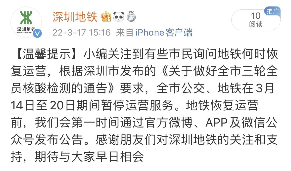 对此,记者向深圳地铁求证,深圳地铁表示,根据深圳市发布的《关于做好全市三轮全员核酸检测的通告》要求,全市公交、地铁在3月14日至20日期间暂停运营服务。地铁恢复运营前,深圳地铁会第一时间通过官方微博、APP及微信公众号发布公告。