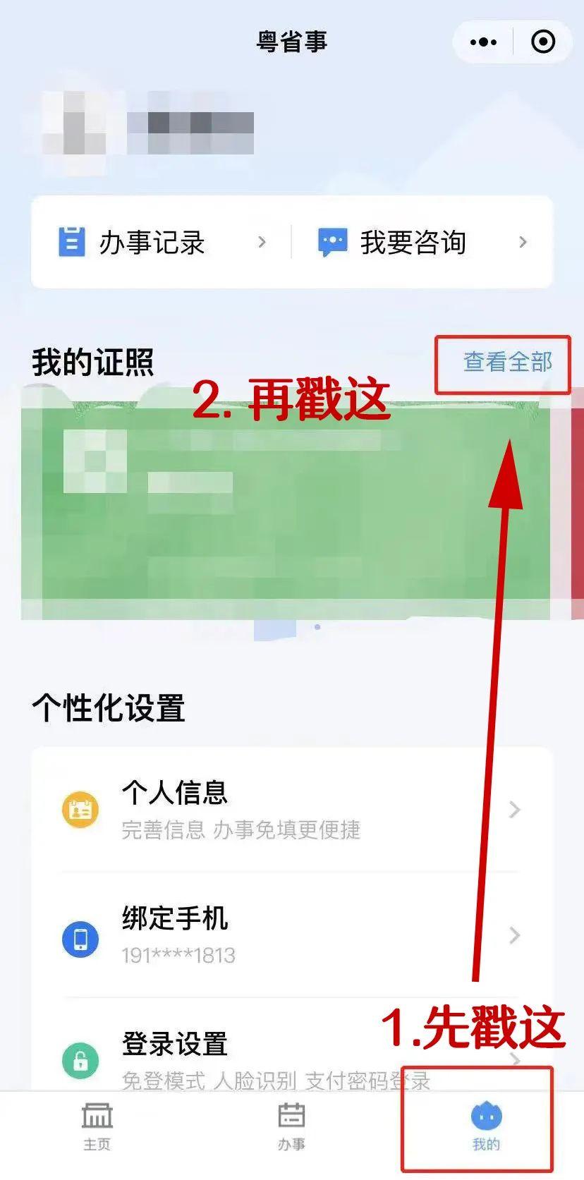 1. 进入“粤省事”小程序,点“我的”——“我的证照”——“查看全部”