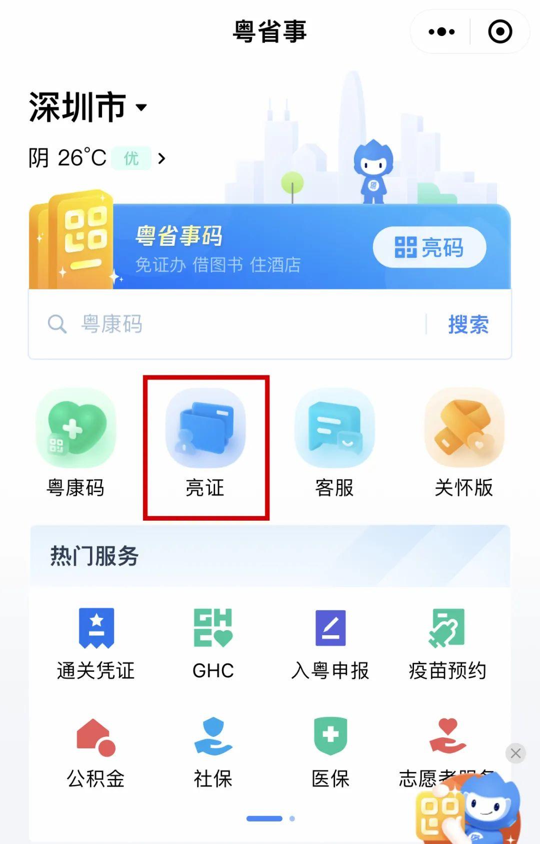 进入“粤省事”小程序,在首页点“亮证”,按提示操作即可查看