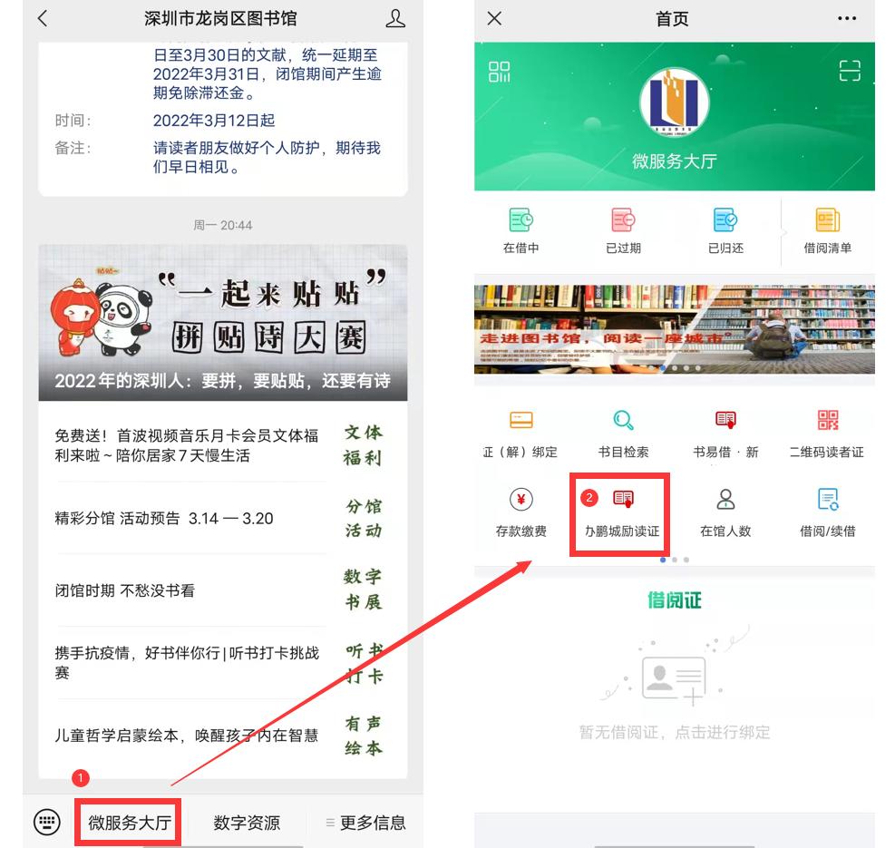 公众号菜单-微服务大厅-鹏城励读证,即可免费在线办理