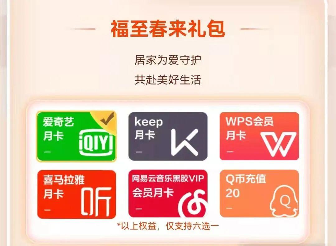 居家礼券一张(六选一:爱奇艺月卡/KEEP月卡/WPS月卡/喜马拉雅月卡/网易云音乐月卡/Q币)