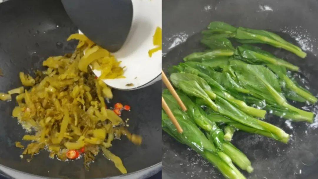 下指天椒、酸菜,炒香,出锅;开水下油、下青菜、烫熟、捞出。