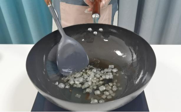 热锅冷油下冰糖炒糖色,炒至枣红色,加入约5斤水。