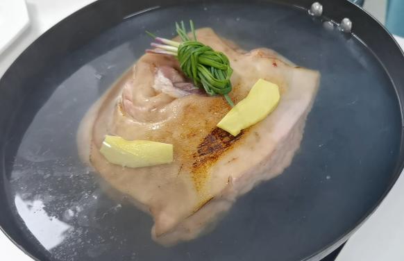 将烧过皮的猪肘洗净,下姜葱料酒焯水备用。