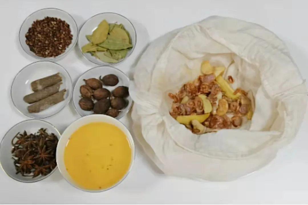 将干葱头、姜蒜炸香,依次和干香料一起装煲汤袋,留葱油用碗装好。
