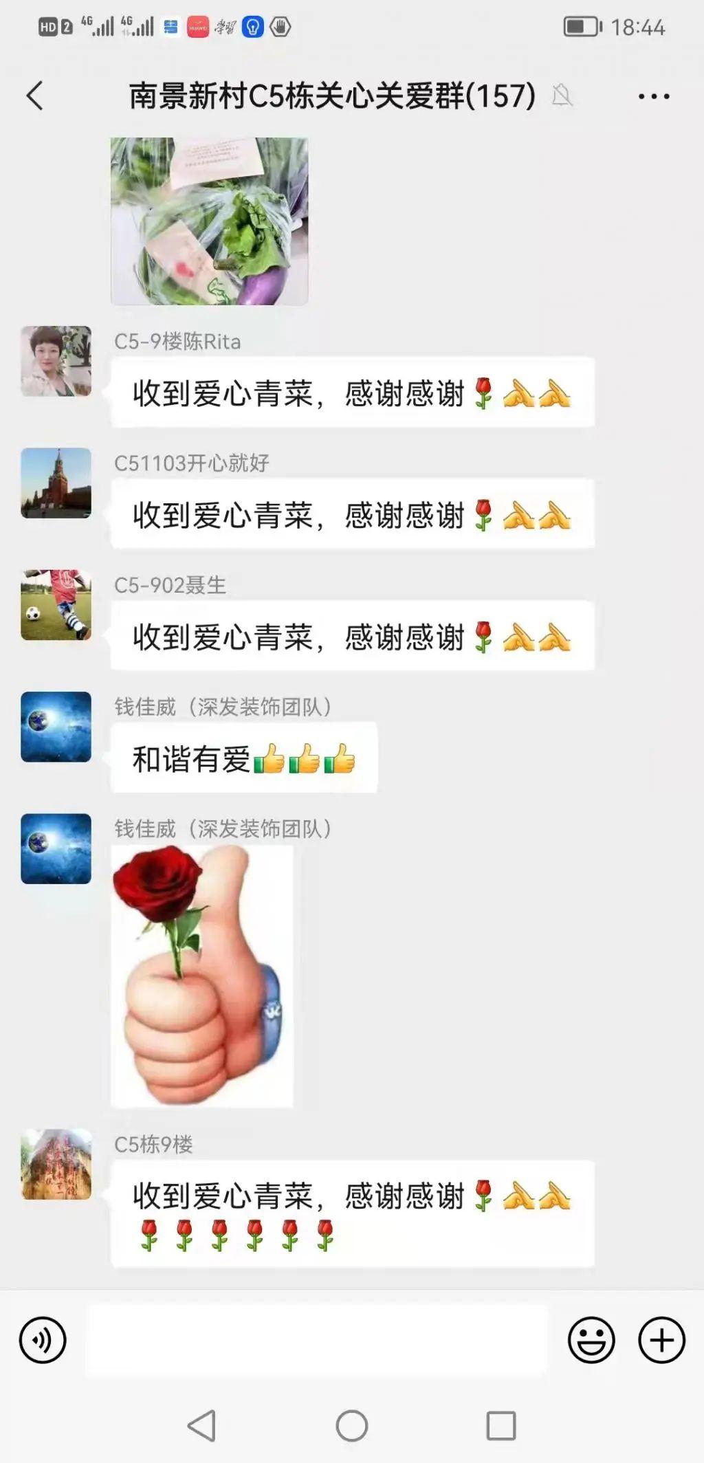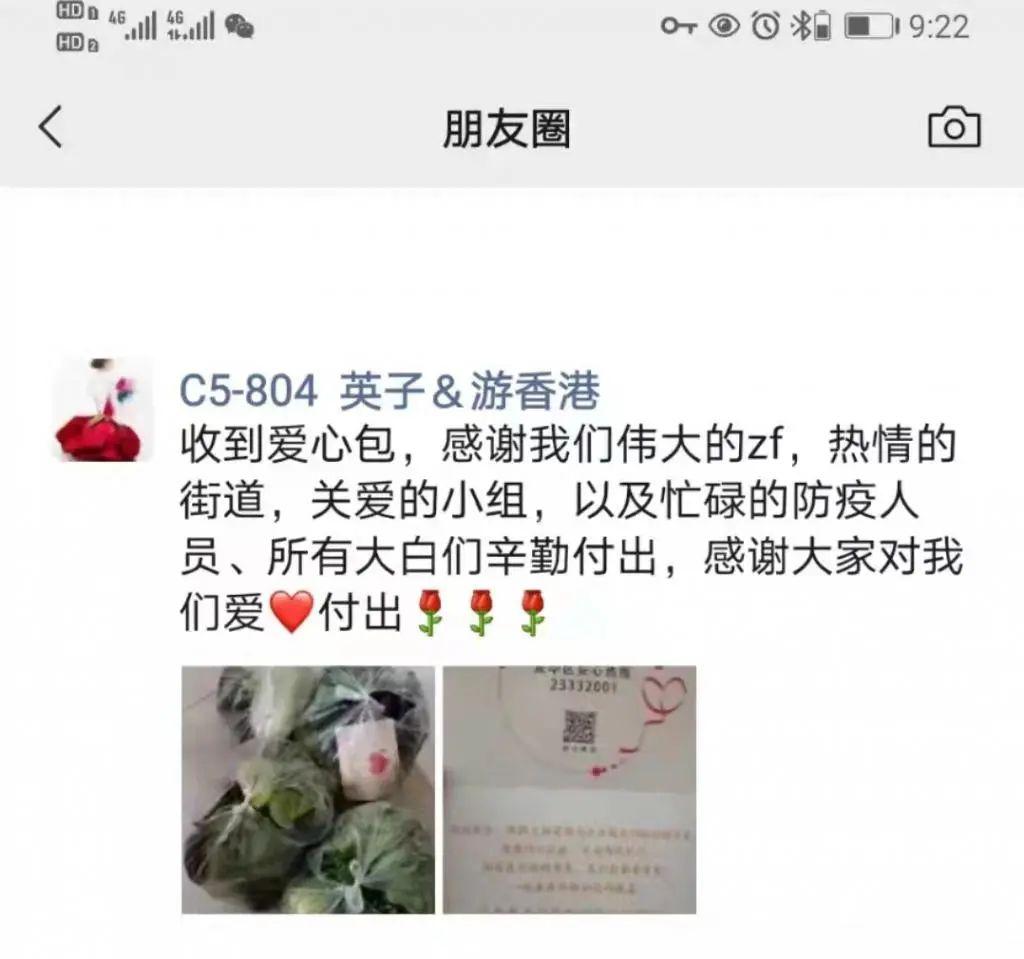 在居民群里,满屏的玫瑰花和大拇指,居民们纷纷接力刷起 " 收到爱心青菜,感谢各位工作人员!";在朋友圈里,也充斥着居民浓浓的谢意," 人间有爱!隔离在家还收到社区大白的爱心贺卡和蔬菜,真的很感动,希望疫情快点离开,大家都能恢复正常的生活和工作。" 这一场来自政府、爱心企业、社区的 " 爱心接力 " 落下了帷幕,但温暖却久久萦绕在每个人的心中。