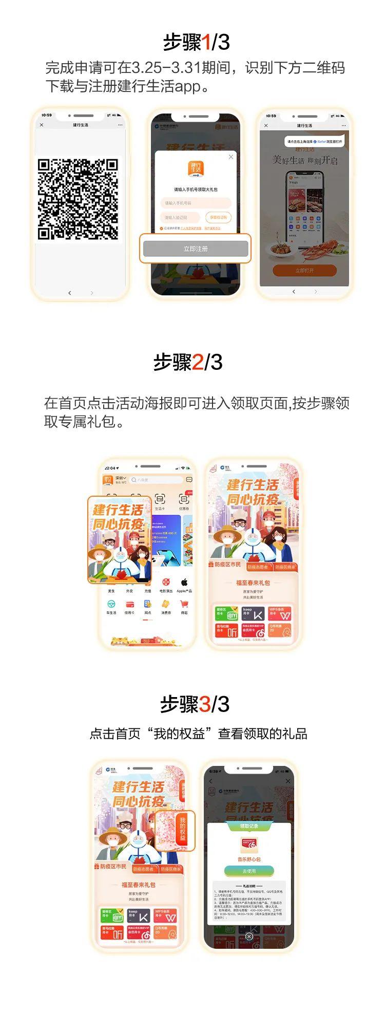礼包于3月25日-3月31日陆续发放,在此期间白名单用户直接登录“建行生活”APP 领取即可。长按识别下方二维码完成“建行生活”APP下载与注册(注册手机号需与申请的手机号一致)。