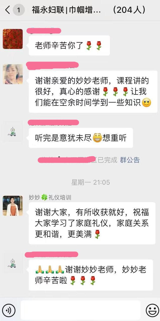 福永街道妇联为居民从容应对疫情精心准备了一系列的线上活动:一是开展女性形象提素计划之“线上礼仪直播”活动,设置为期11天的个人礼仪修养提升系列及形象气质提升系列线上直播课程,引领辖区女性在疫情期间内强素质、外树形象、踔厉奋发。二是创新家庭教育服务形式,联合心理咨询师团队和家庭教育亲子讲师团队,在居民服务微信群每周开展线上家庭教育微课。