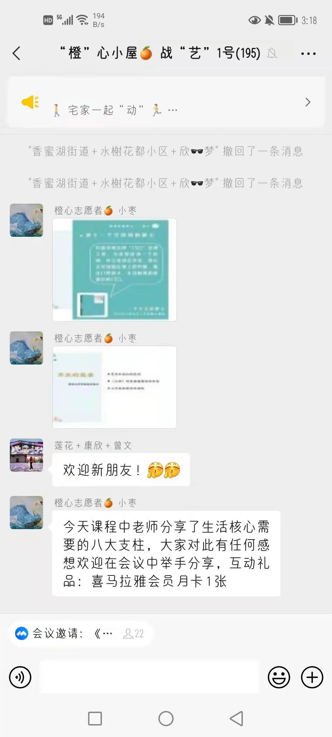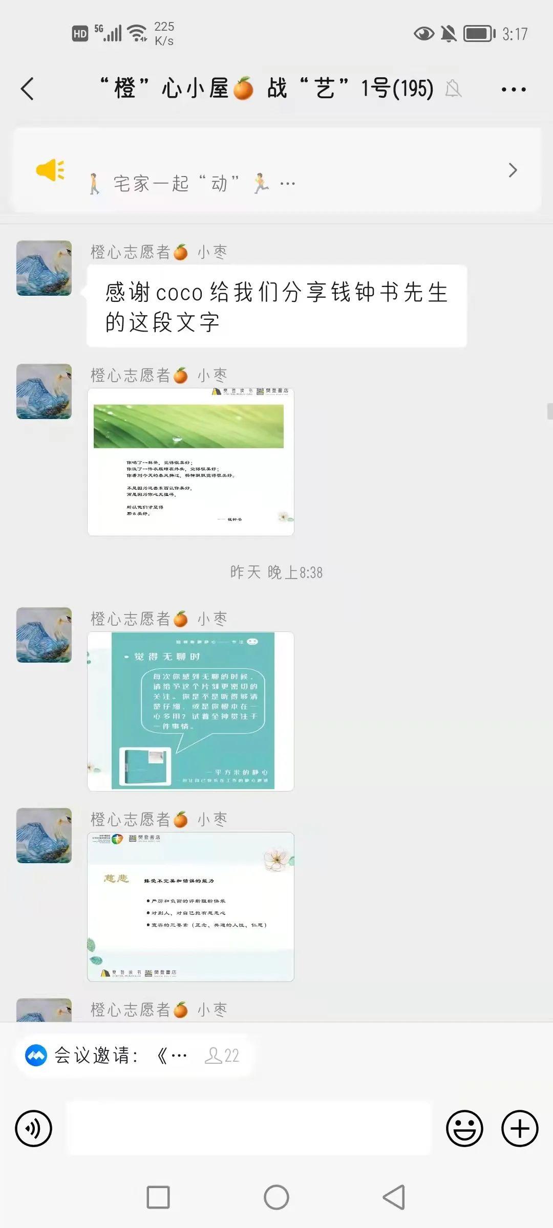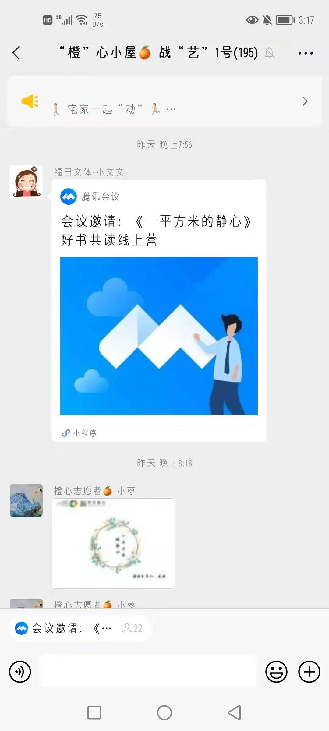 ↑3月16日晚好书共读线上营——《一平方米静心》,小文文与群友在“橙”心小屋互动交流。