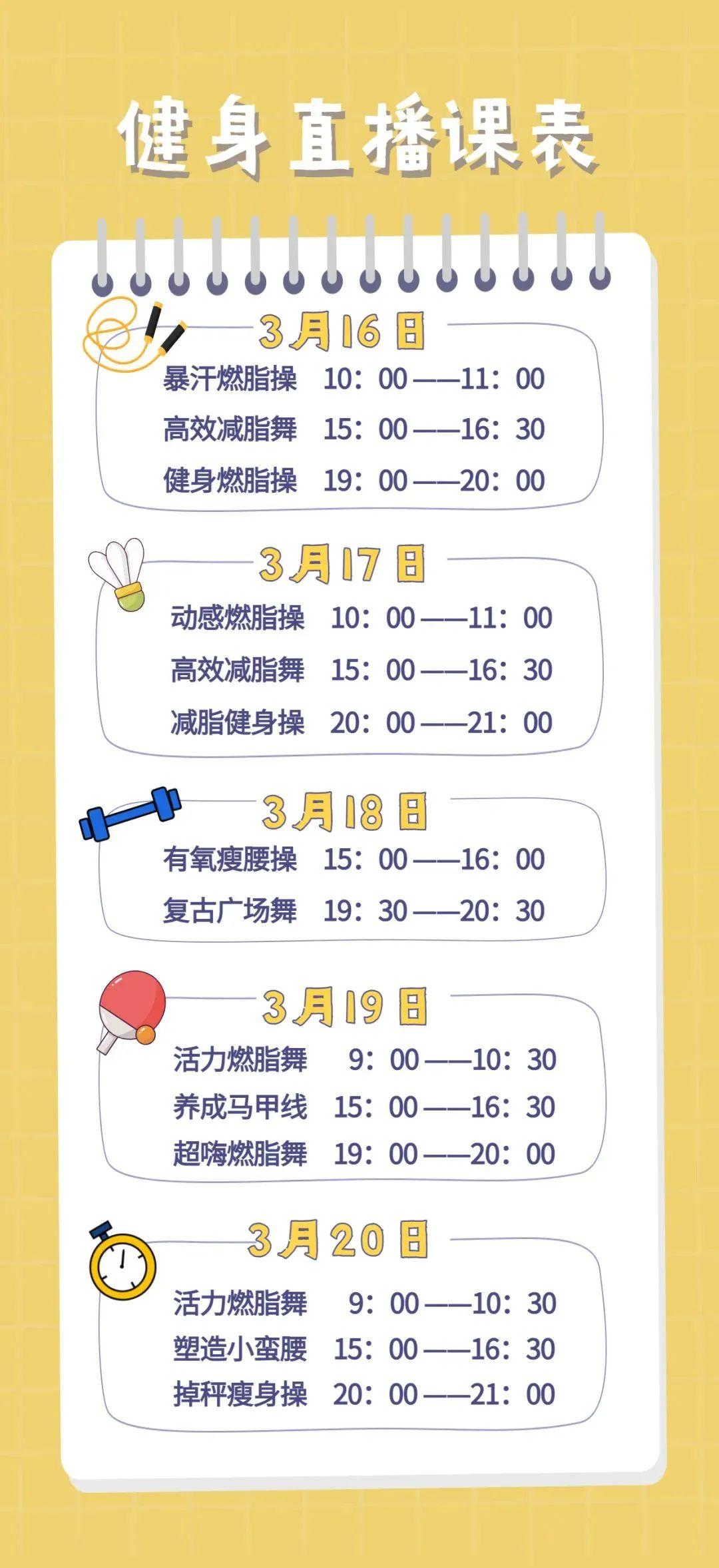 我们的战“艺”活动在开展过程中时刻关注大家的反响和建议,不断更新内容,升级品质。近几日,不少粉丝提出了开设直播互动、体育健身课程的需求,因此,“一起动”由打卡转变为直播,3月16日至20日,福田区公共文体中心与深圳市社会体育指导员协会合作,开设14堂健身直播课,包括活力燃脂舞、健身燃脂操、有氧瘦身操等丰富的内容,由优秀社会体育指导员、专业教练带领大家一起动起来。