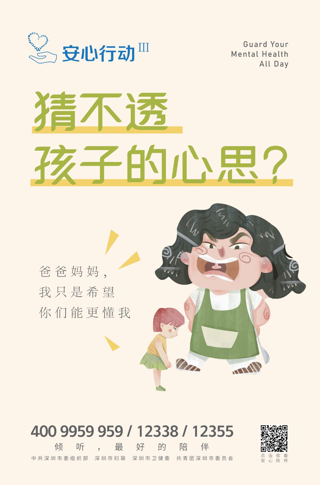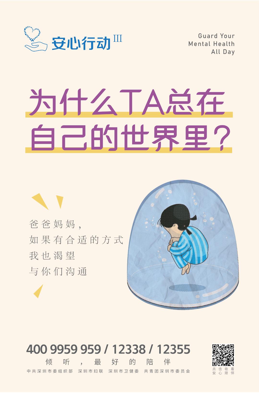 结合疫情防控和开学季市委组织部、市妇联市卫健委、团市委联合设计推出了“安心行动Ⅲ”青少年心理健康系列宣传海报海报中有安心热线、“安心陪伴”音视频二维码敬请关注!图文 深圳市妇联编辑 王宇琦审核 徐晔昕、王晓婷、陈圆圆