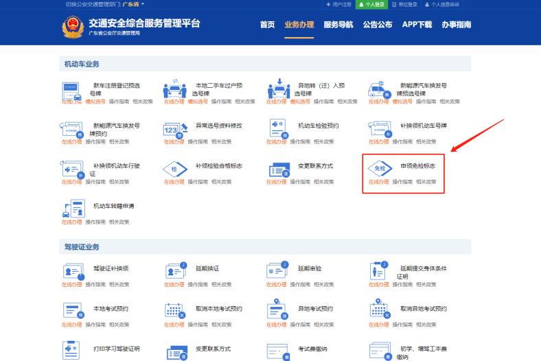 通过“交管12123”手机App或互联网综合服务平台(gd.122.gov.cn),进入免检车申领检验标志业务,可以为已备案的本人免检车辆申领检验标志。