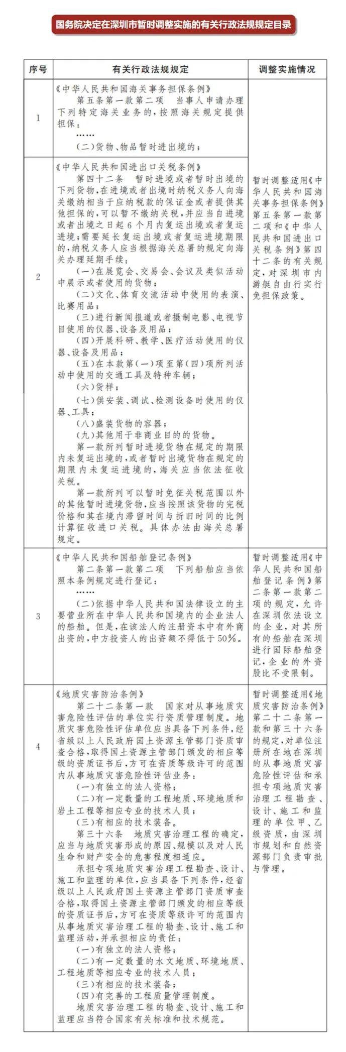 《批复》提出,在深圳市暂时调整实施《中华人民共和国海关事务担保条例》《中华人民共和国进出口关税条例》《中华人民共和国船舶登记条例》《地质灾害防治条例》4部行政法规的有关规定(详见本文附件)。