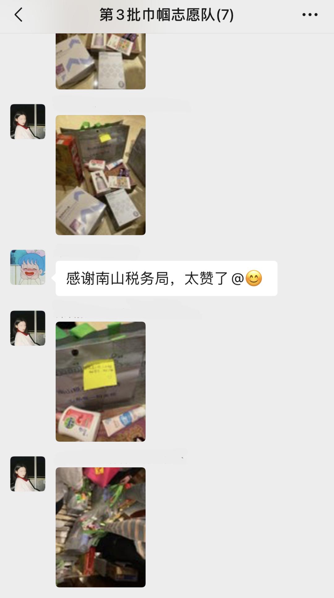 3月17日,党委书记、局长蔡伟群在封闭办公的情况下,亲自安排部署第六批封闭战疫志愿者的慰问工作,认真了解战疫志愿者生活需求,积极组织筹措购买战疫及生活物资,派出战疫后援小分队先后前往福田区深康村社区、竹林社区和益田社区看望慰问第六批封闭战疫志愿者,为南山区税务局及兄弟单位的志愿干部一并送去“贴心关怀大礼包”,主要包括N95口罩、小风扇、洗手液、功能性饮料、防蚊用品、能量食品、饭盒等,还附上了贴心的加油小纸条。收到南山区税务局党委关心的四位“战役大白”及其他单位的干部们纷纷感慨这个“大礼包”送得有爱、有心、有感。