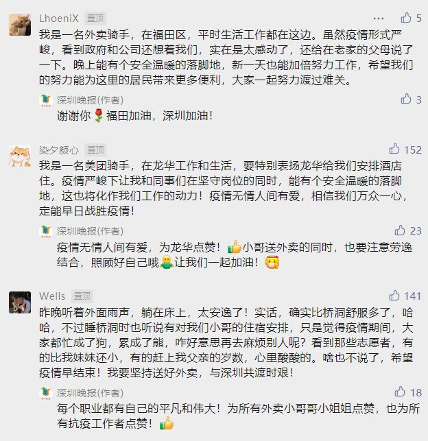“他们确实是为大家提供生活便利很重要的一群人,同时也为深圳的大爱及深圳人都能看到他们的重要和辛苦感到欣慰。辛苦了!”