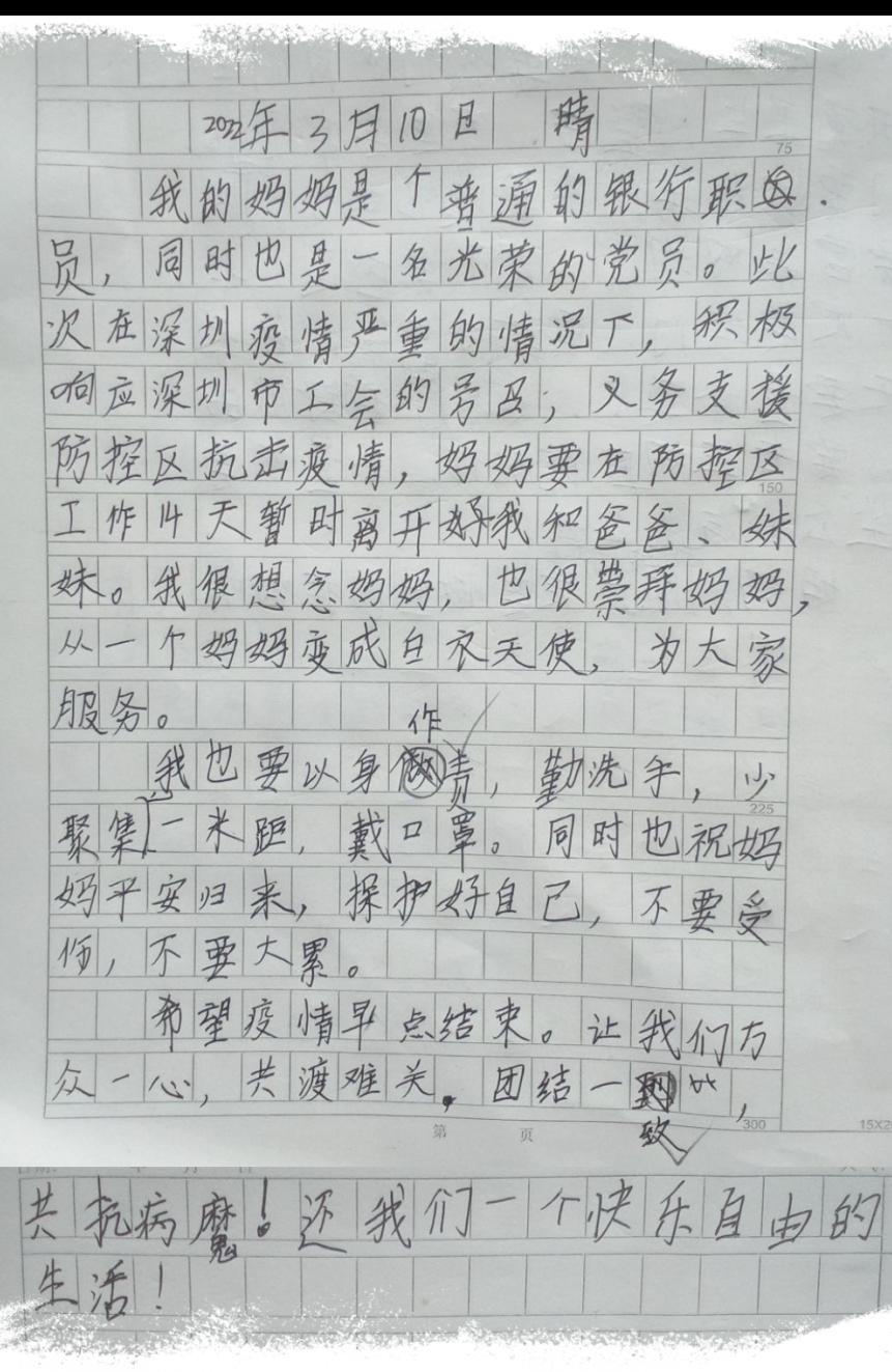 为了本次抗疫工作,我不得不短暂离开家庭、离开老公和孩子。前两天,我看到了我小孩的作文作业,感觉到他在家里等我的时候很想我,能够被他崇拜我真的很荣幸!我坚信,我们共同努力,终将战胜疫情,待春暖花开,我们一起撒欢,宝贝等我回家!