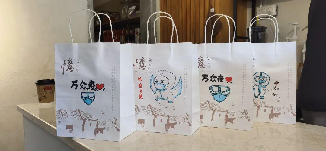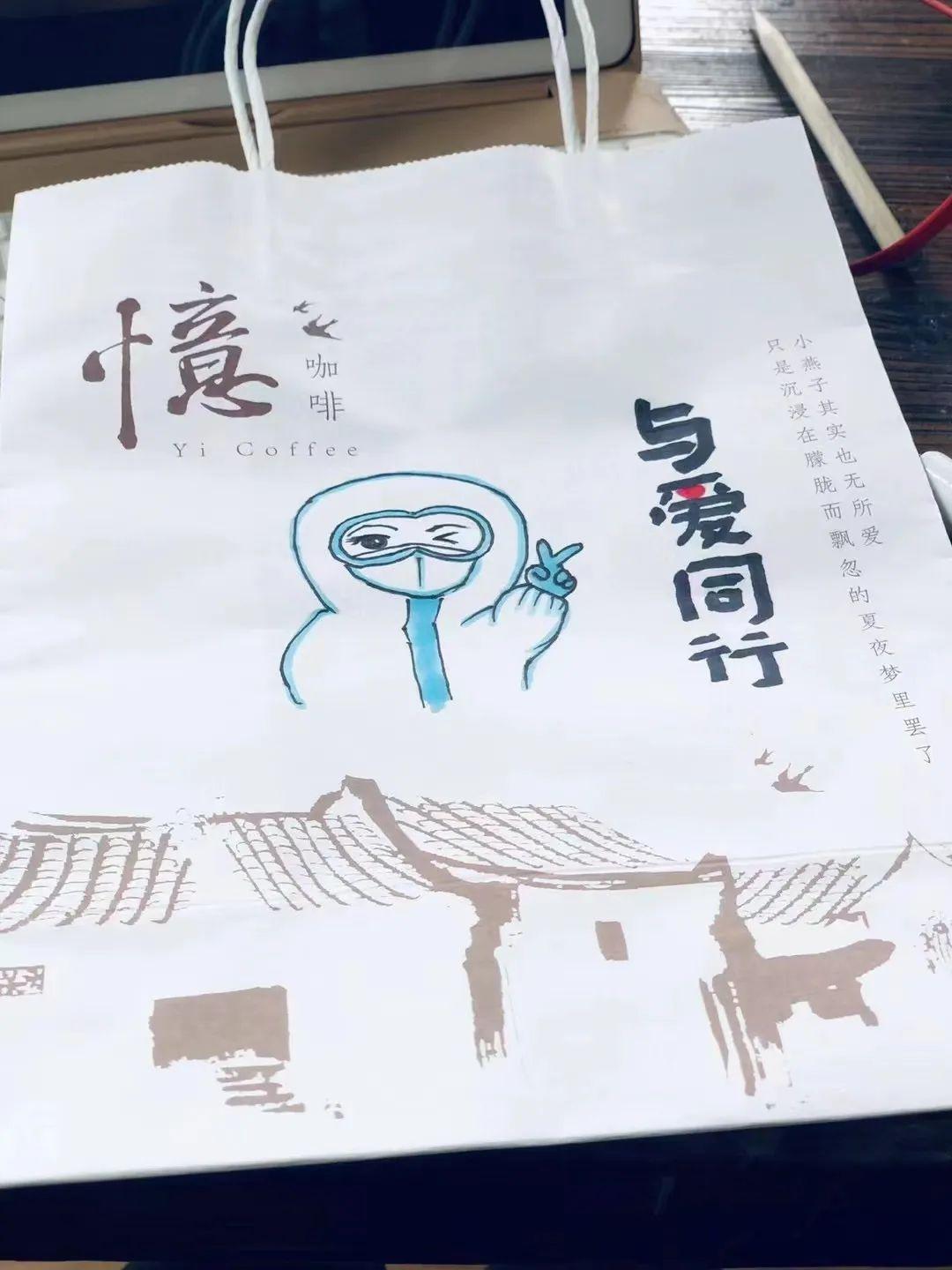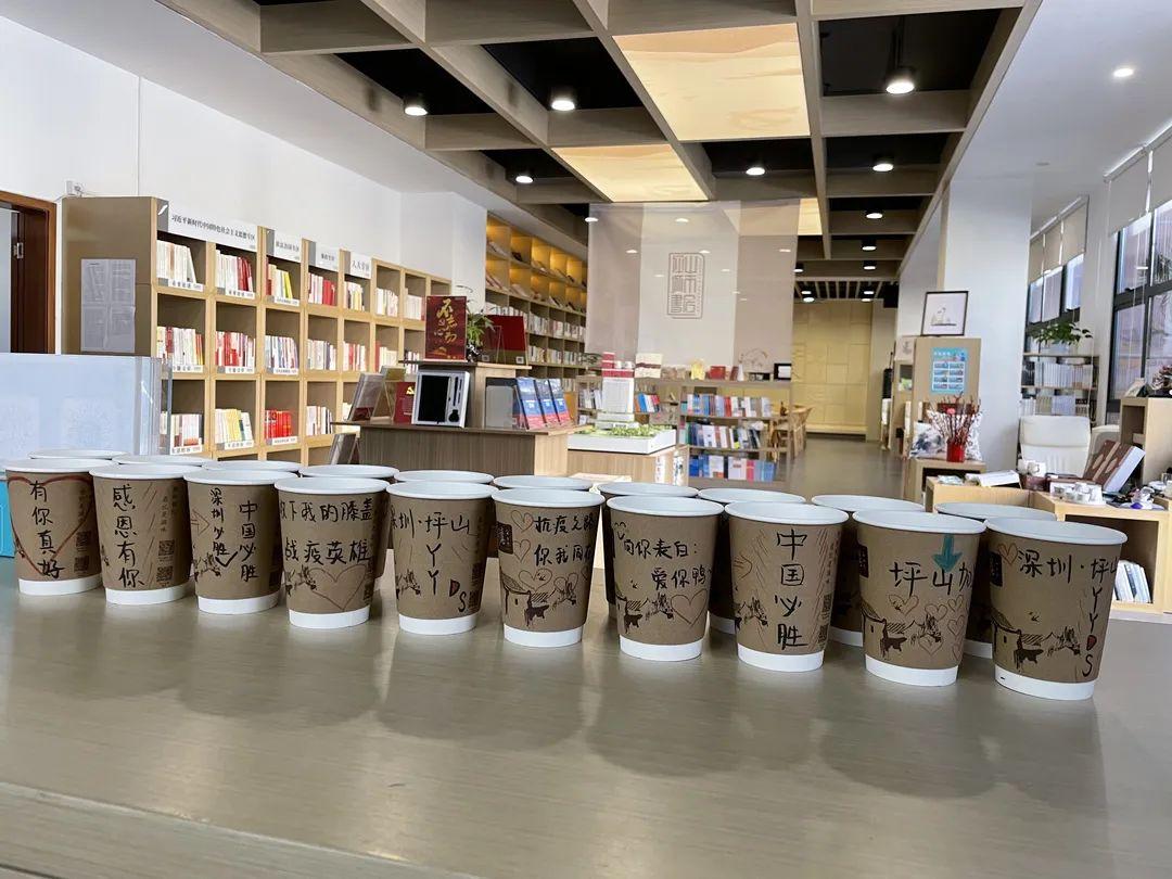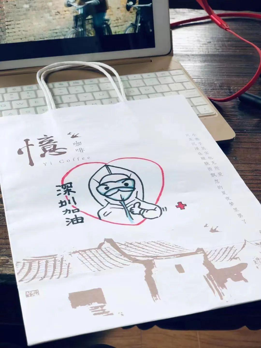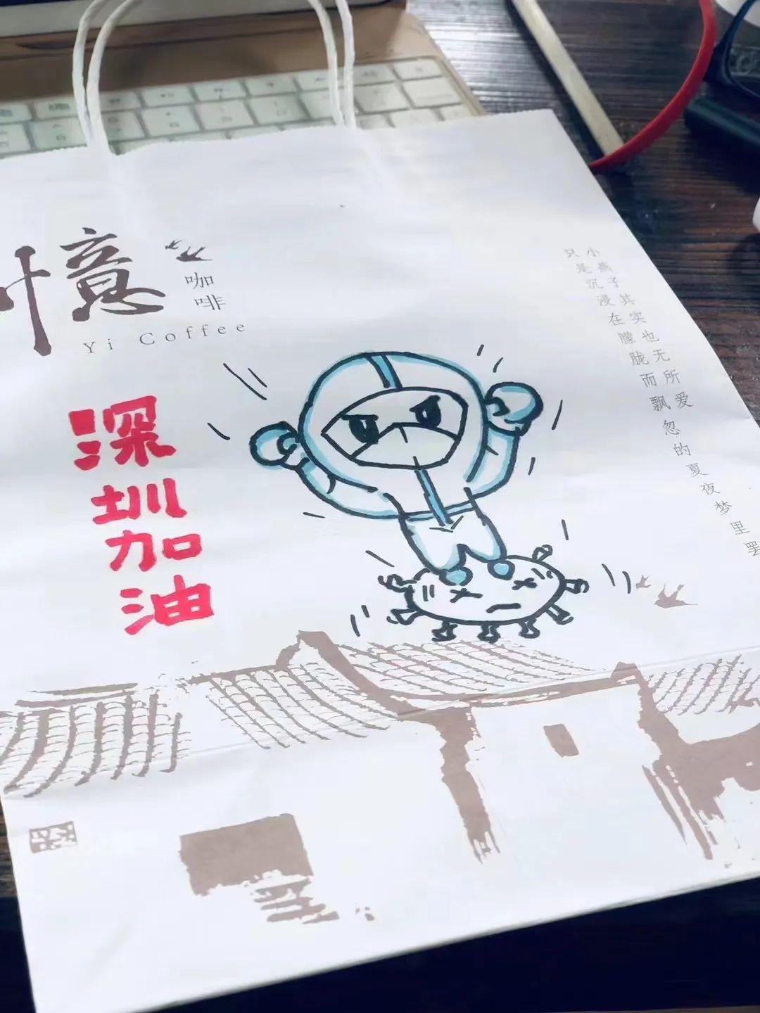 原来,为了给一线工作人员加油打气,来自亦山品物及坪山城市书房的“温暖小队”精心手绘,为每一杯奶茶打造了专属名片。一个个写着“抗疫战士,你们辛苦了,加油”的咖啡杯,一个个画着与爱同行“白衣天使”的包装袋,为“战疫”注入温暖力量。