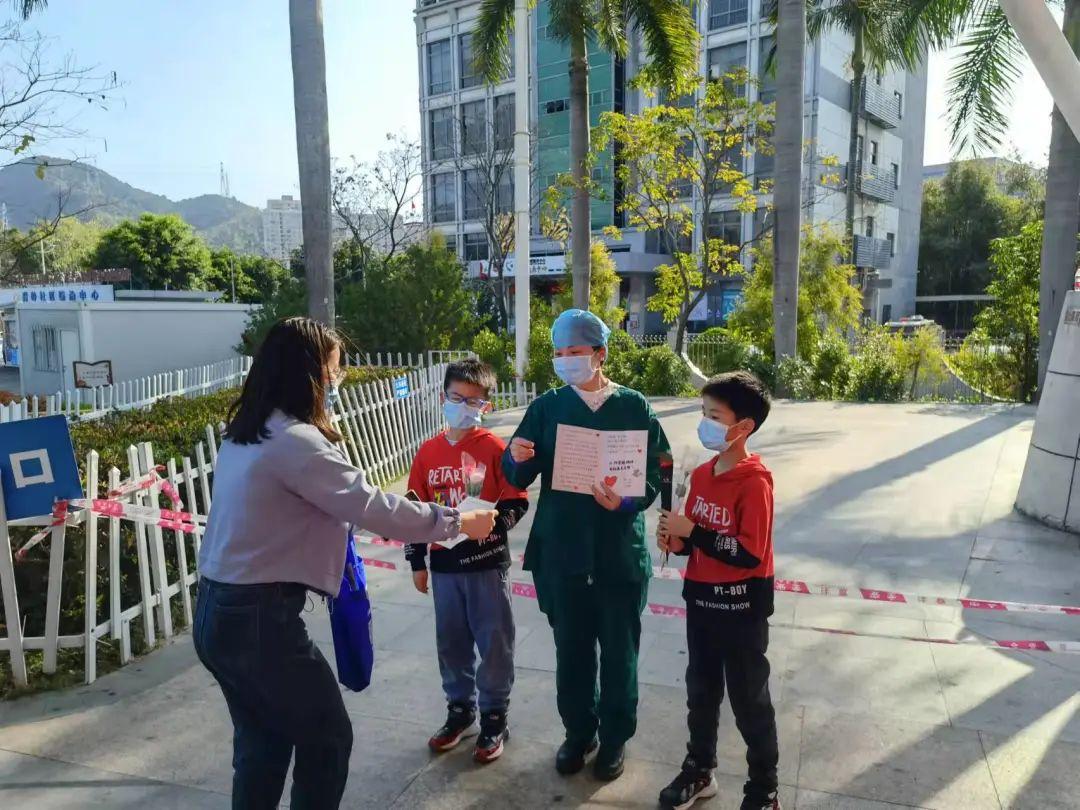 在碧岭社区核酸检测点,四名小朋友在核酸检测后,给医务人员送上了手写感谢信和鲜花。信上一整页纸写满了对医护人员的感谢,旁边还有手绘的医护人员形象和卡通图案。