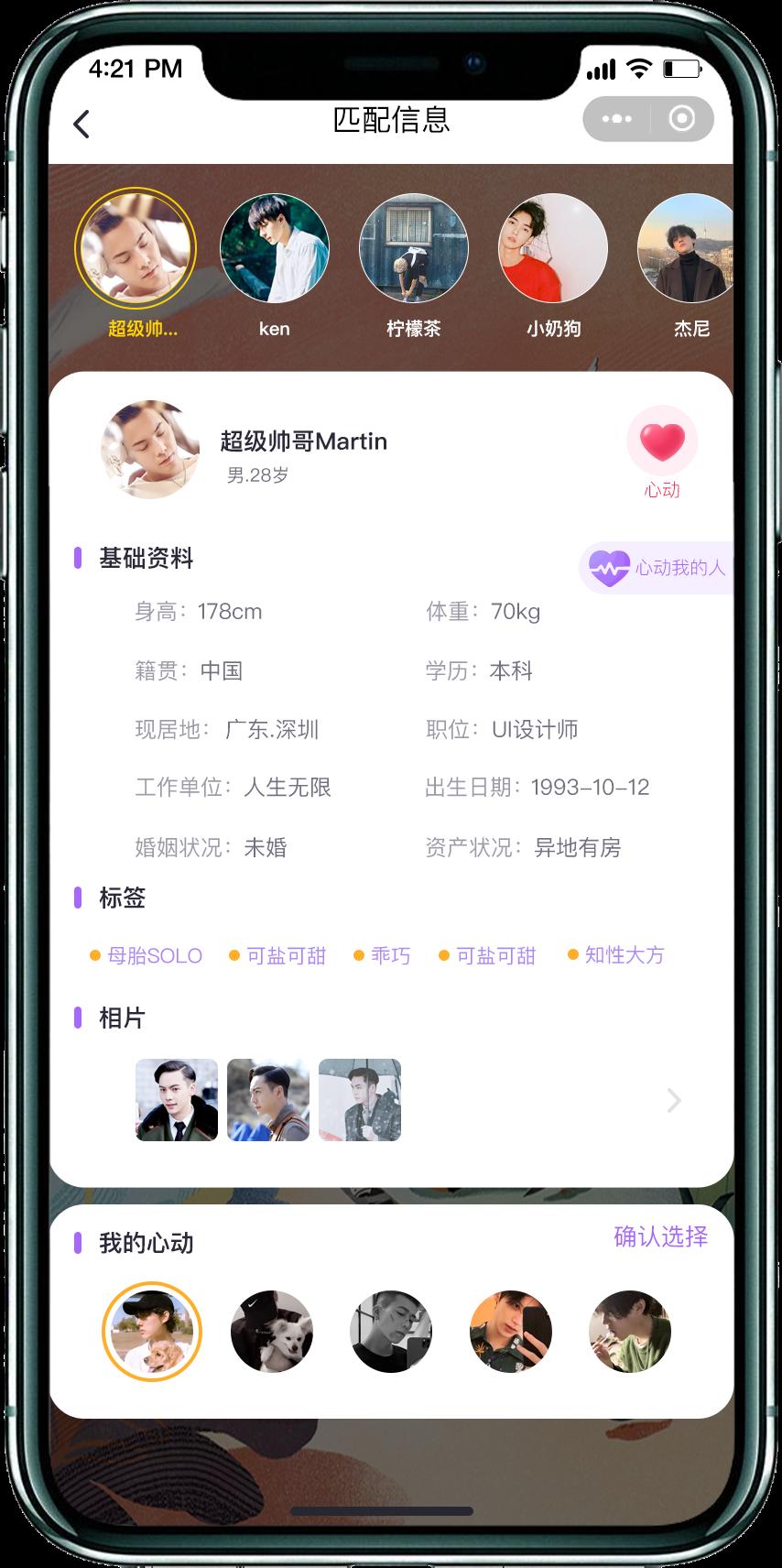 系统根据你选择对象的标签及年龄标签进行匹配。当异性满足你心仪的匹配标签(其中之一个)及年龄标签(其中之一个),系统将推送给你异性的资料信息,你可查看并为TA点击心动❤。如果TA也选择你,互选成功,成为cp(仅可互选成功一名)。
