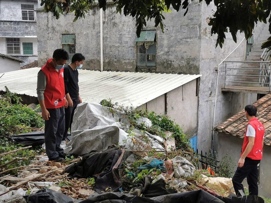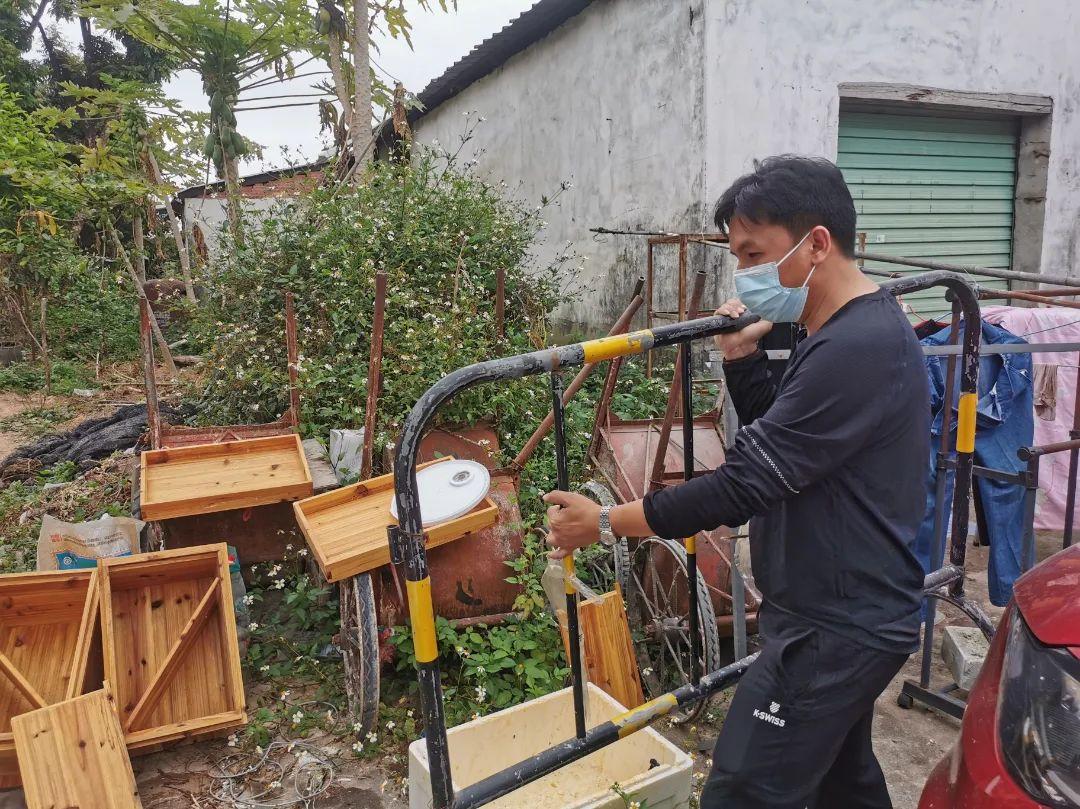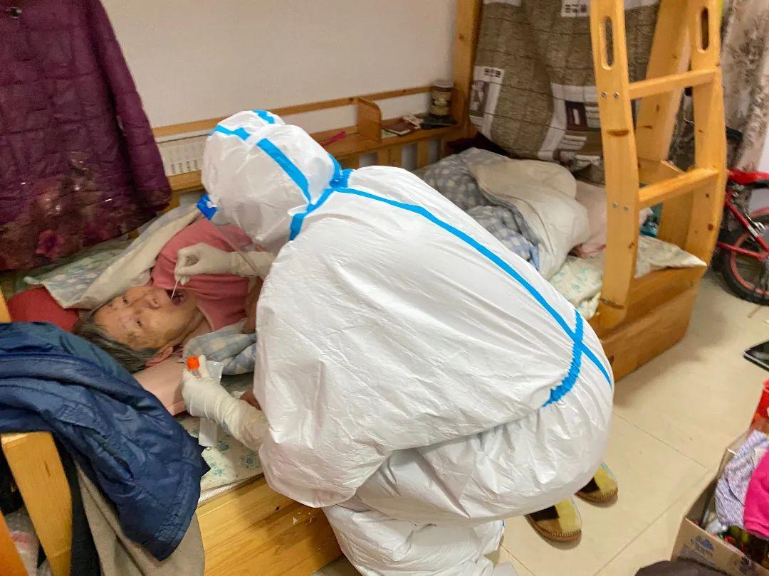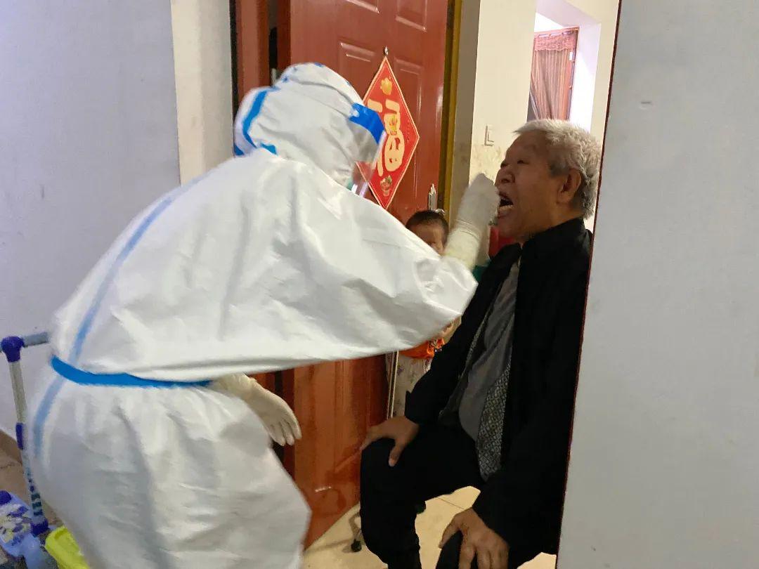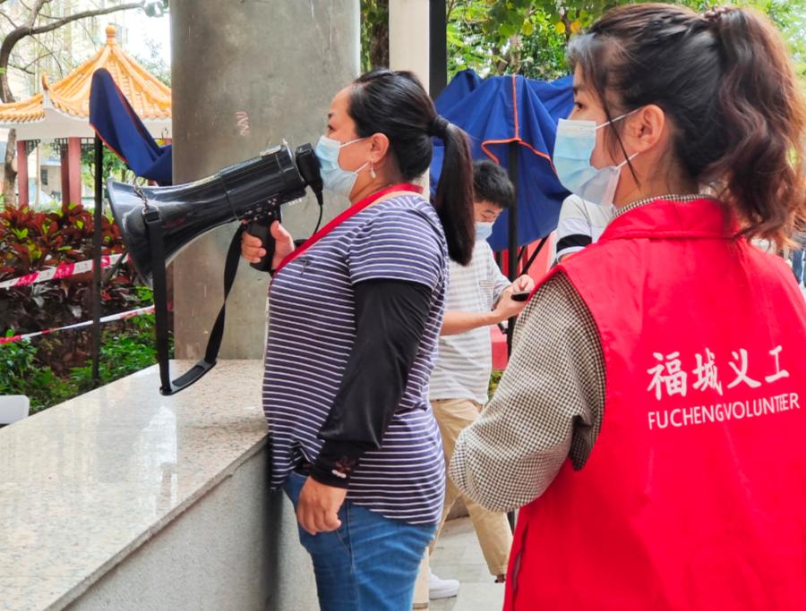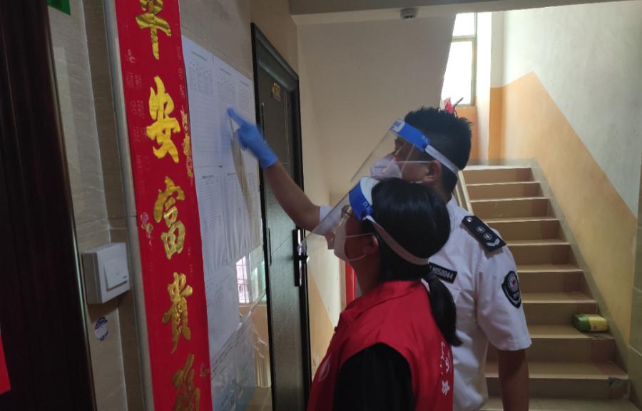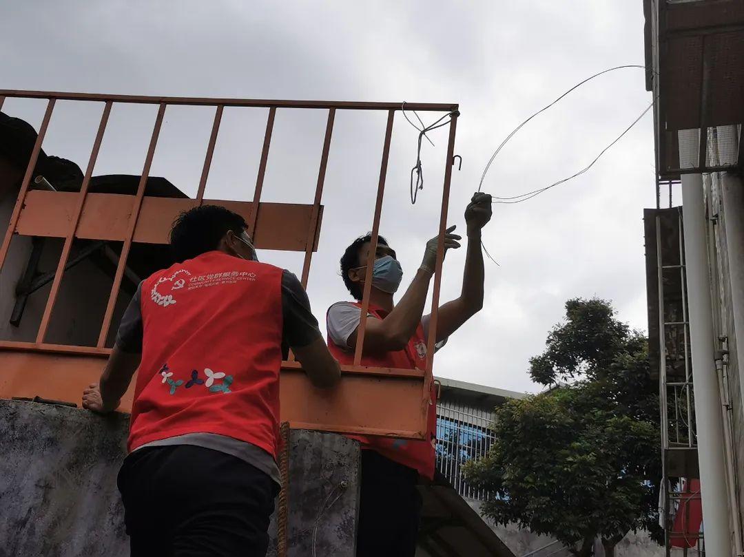 社区工作人员庄万行蹲在阶梯上接听居民求助电话