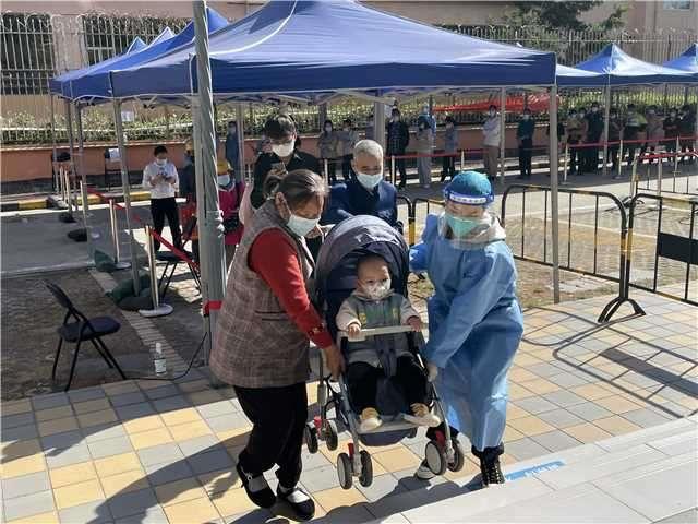 小朋友们做核酸检测感到害怕的时候,这位高大的“大哥哥”会友爱地拿核酸检测小贴纸去逗乐孩子,告诉他们要化身成为战胜“奥密克戎”的圣斗士,化解孩子的恐惧。