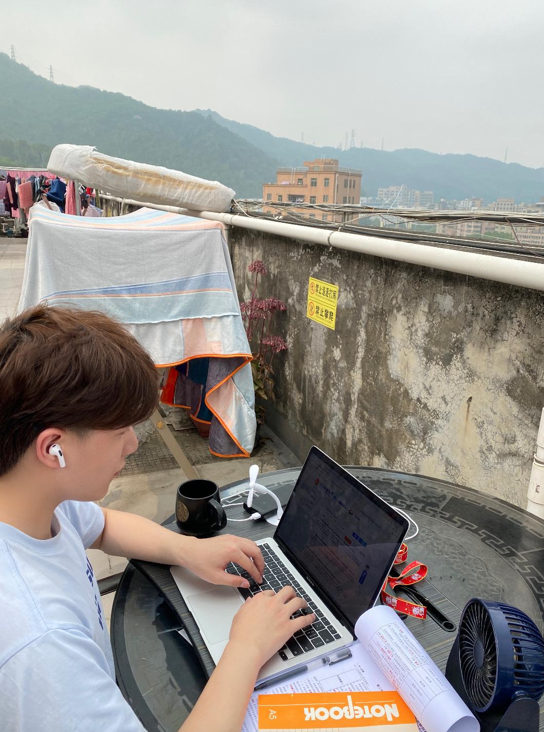 急中生智的危亦伟灵光一闪,要不跑到天台进行“居家接线”?测试过信号和环境安静程度都能满足工作需求后。14日上午7时许,危亦伟起早收拾好把笔记本、笔、耳机、小桌子等办公用具,将之搬到了十二层高的楼顶,搭起了一个“临时工位”,在空旷的楼顶一人值守。
