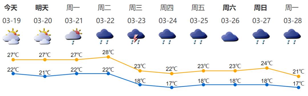 ●3月19日我市阴天到多云,气温22~27℃;风力微弱;湿度75%~100%。19日至22日天气暖湿,多云为主,部分时间可见阳光,间中有小雨,早晚有轻雾;22日夜间至25日,受较强冷空气影响,气温下降并伴有阵雨或雷阵雨,26日渐转多云。