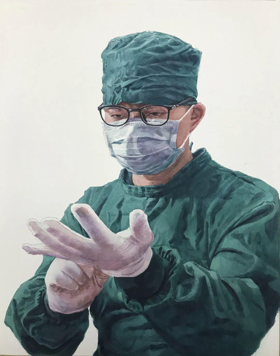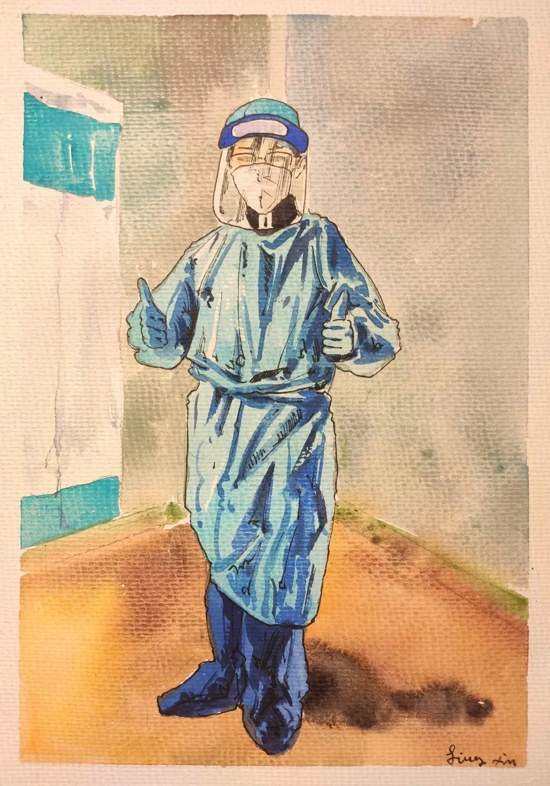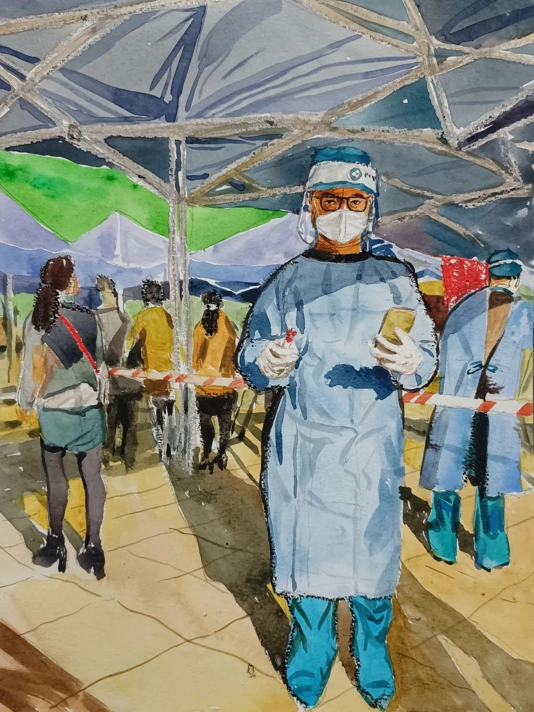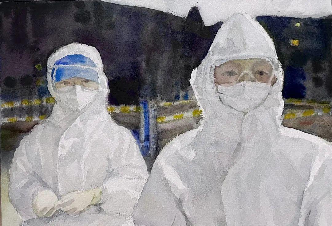 《抗疫——争分夺秒》 / 陈跃刚。 23×31cm, 纸本水彩
