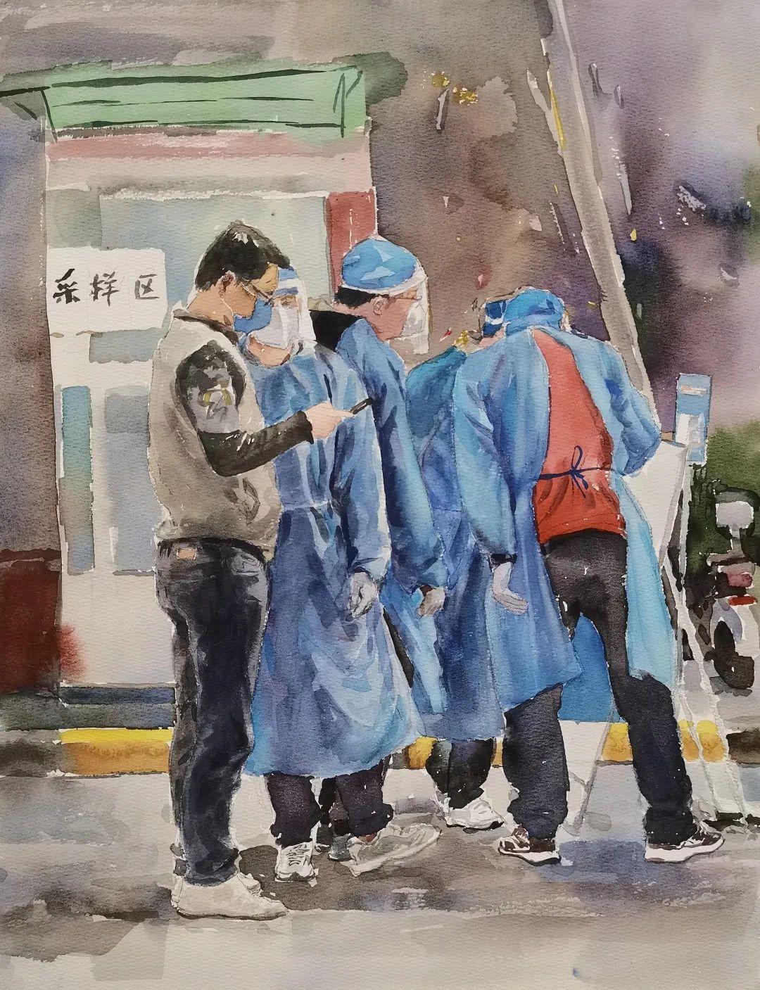 《抗疫行动一》 / 陈跃刚。 53×38cm, 纸本水彩