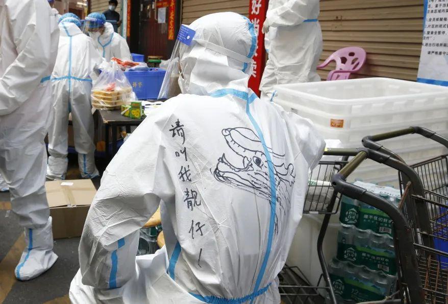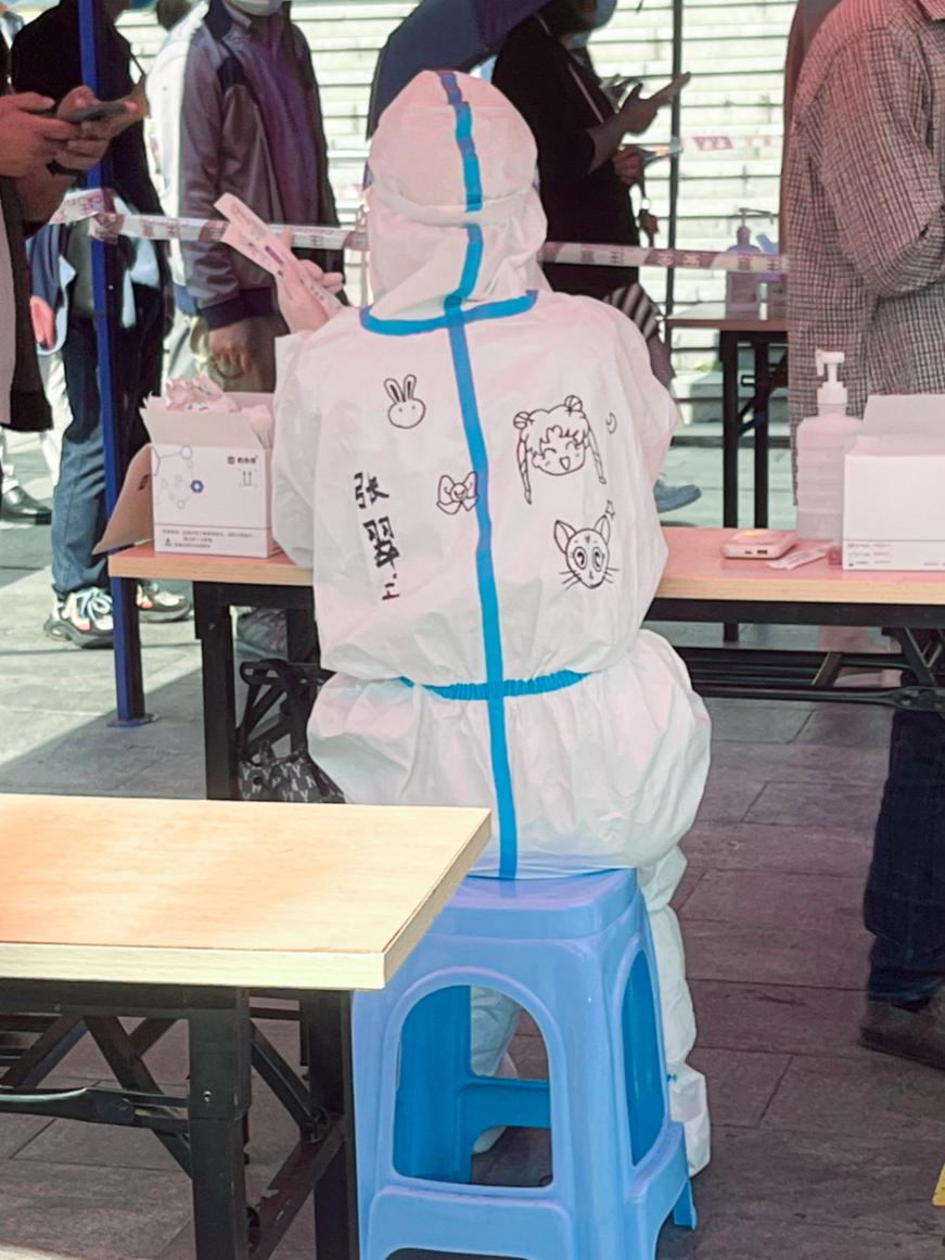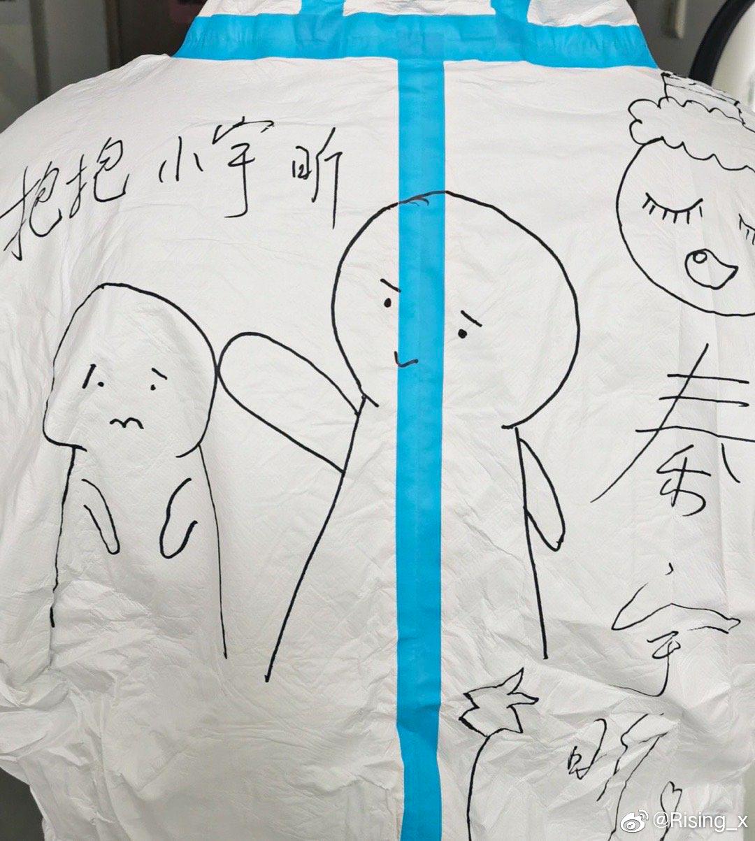 有的“大白”会在防护服写上单位、名字等个人信息,有的还会写一些话语,或者随手涂鸦,字里行间,或美或抽象的图案里,记录着他们的心情态度,传递着他们对城市的朴素祝福。