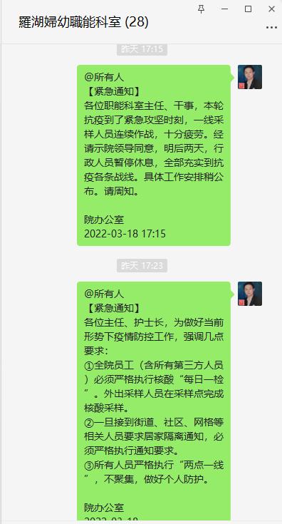 为了缓解抗疫一线人员的辛劳,给他们挤出一些休息的时间。院领导于昨日号召职能科室全体员工,全部停止周末的休息,投入抗疫各条战线,缓解一线人员的压力,给他们一个轮休的时间。