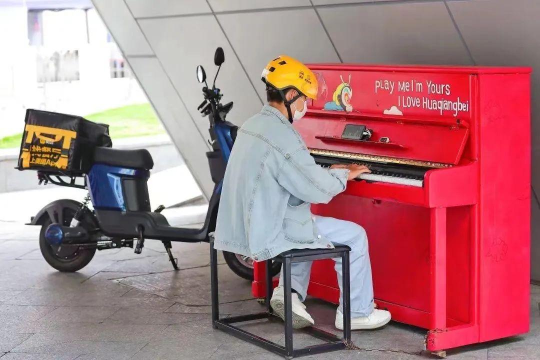 ▲3月16日中午时分,外卖骑手潘先生在华强北步行街公益钢琴处练习弹琴。张焱焱/摄