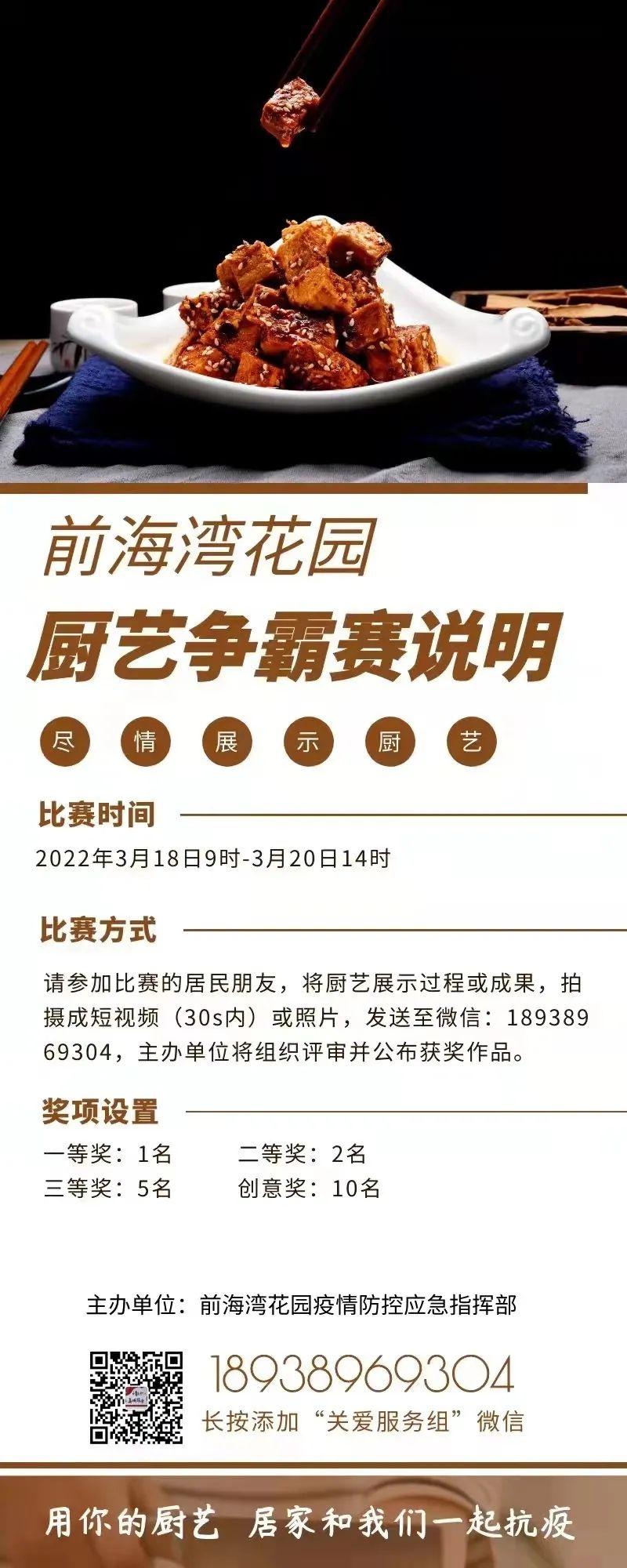 3月18日,前海湾花园疫情防控应急指挥部为居民们举办了“前海湾花园厨艺争霸赛”,通过线上评审、投票的方式,寻找小区的“隐藏厨神”,用飘香饭菜传递齐心抗疫的温暖。