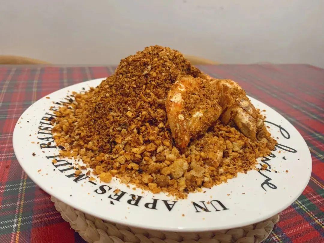 由于家里缺少面包糠和豆豉,张先生用碾碎的全麦面包替代原料面包糠,用北方食材花椒代替了豆豉的味道,做成了一道“椒麻版” 避风塘炒虾。