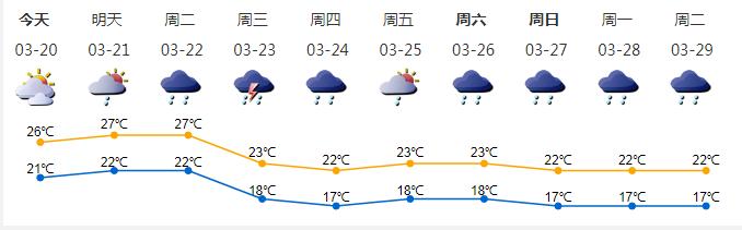 ●3月20日我市多云;气温21~26℃;偏东风3级,沿海、高地和海区阵风6~7级;相对湿度75%~90%;能见度普遍在10~15公里。20日至22日天气暖湿,多云为主,部分时间可见阳光,间中有小雨,早晚有轻雾或雾。22日夜间至25日,受冷空气影响,气温下降并伴有阵雨或雷阵雨。