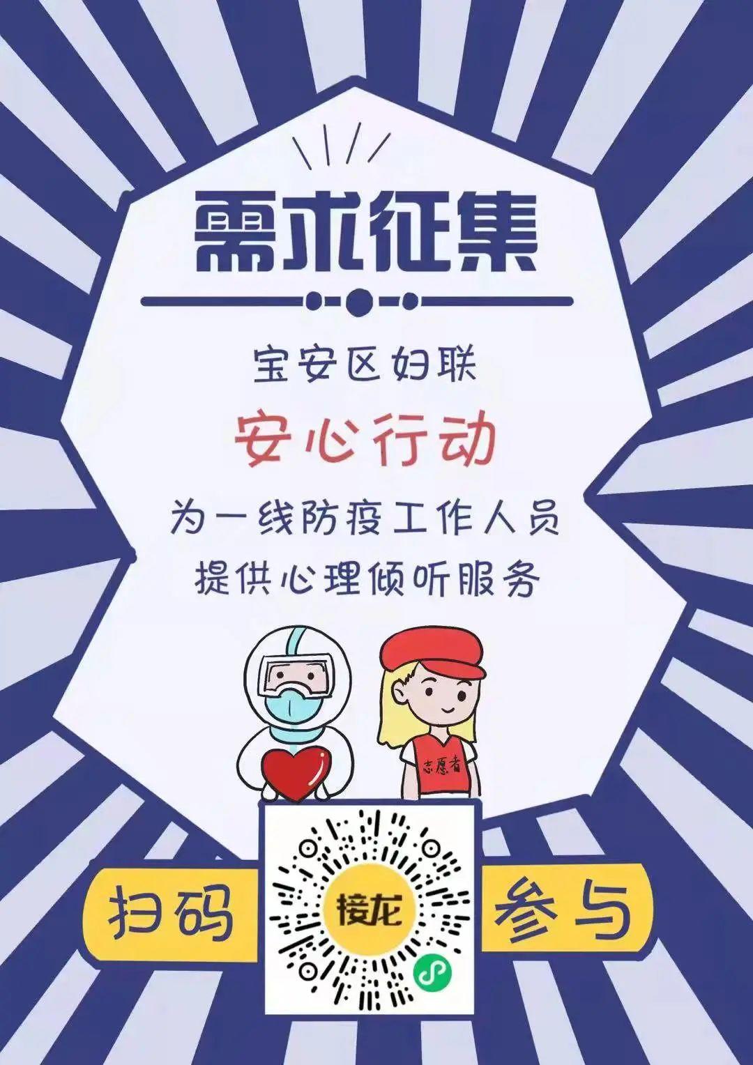 为减轻抗疫一线工作人员家庭负担,确保“后顾无忧”,宝安区文明办、区妇联联合开展“您出征,把家交给我”抗疫家庭关爱行动,面向我区夫妻双方均在抗疫一线的家庭和单亲抗疫家庭,特别是有老人、幼儿、残障人士等家属的家庭提供教育辅导、心理疏导、爱心帮扶等关心关爱服务。