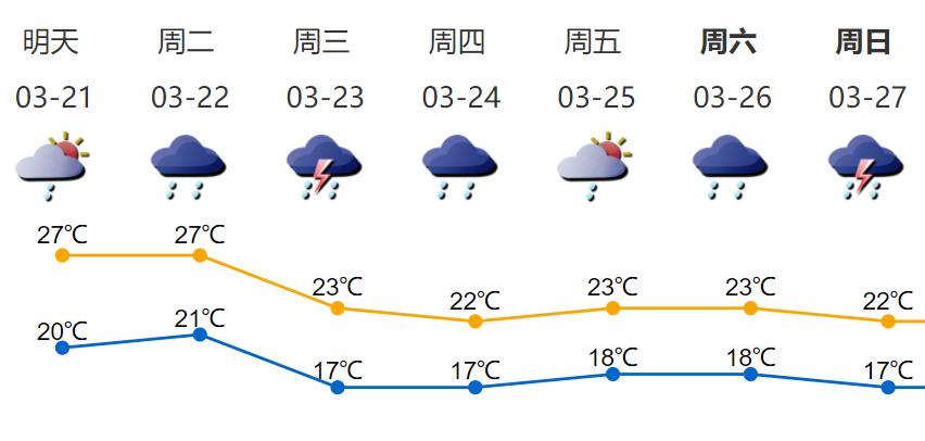 周二夜间到周三有雷阵雨,最低气温下降至17℃左右,天气转凉;