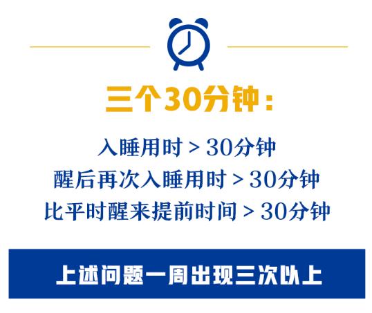 失眠主要表现为:入睡困难(入睡时间超过30分钟)、睡眠持续障碍(整夜觉醒次数≥2次)、早醒、睡眠质量下降和总睡眠时间减少(通常少于6.5小时),同时伴有日间功能障碍(主要包括疲劳、情绪易烦躁或易激动、注意力不集中或记忆障碍、躯体不适、认知障碍等)。