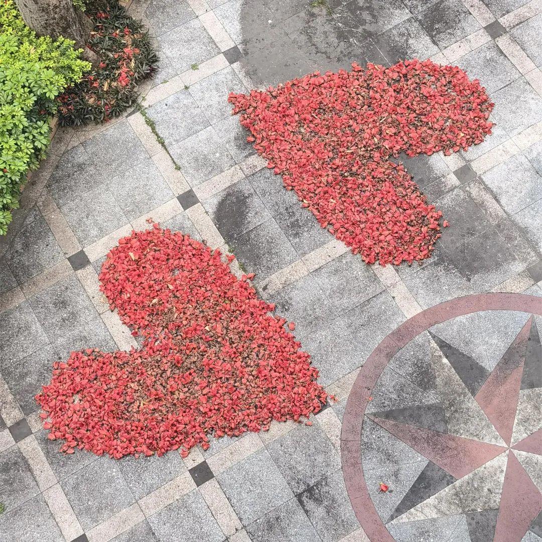 鲁阿姨坦言,起初是觉得落地的木棉花还在盛放,丢掉太可惜,在和其他阿姨将落花扫在一起的过程中,忽然发现聚在一起的木棉花更有美感了,于是就想用木棉花拼成图案,给师生一个惊喜......