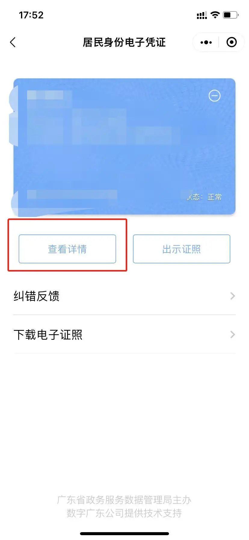 6.需要使用居民身份电子凭证的时候,选择“查看详情”,获取电子身份证照片正反面,供核查使用。