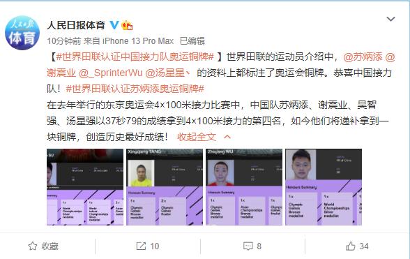 在去年举行的东京奥运会4×100米接力比赛中,中国队苏炳添、谢震业、吴智强、汤星强以37秒79的成绩拿到4×100米接力的第四名,如今他们将递补拿到一块铜牌,创造历史最好成绩!