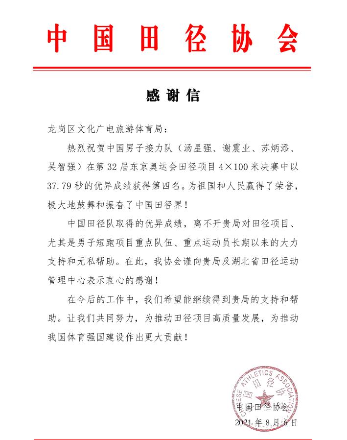 为备战东京奥运会,苏炳添、谢震业等二十多名国家田径队短、跨项目运动员于2020年11月中旬便已抵达深圳大运中心,进行最为关键的赛前封闭式集训。赛后,中国田径协会也给龙岗区发来了感谢信。